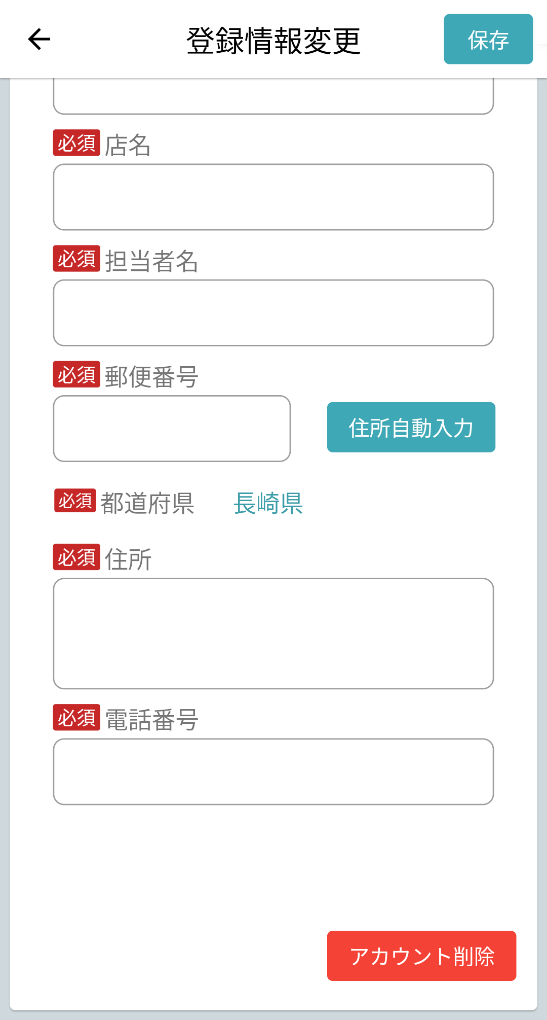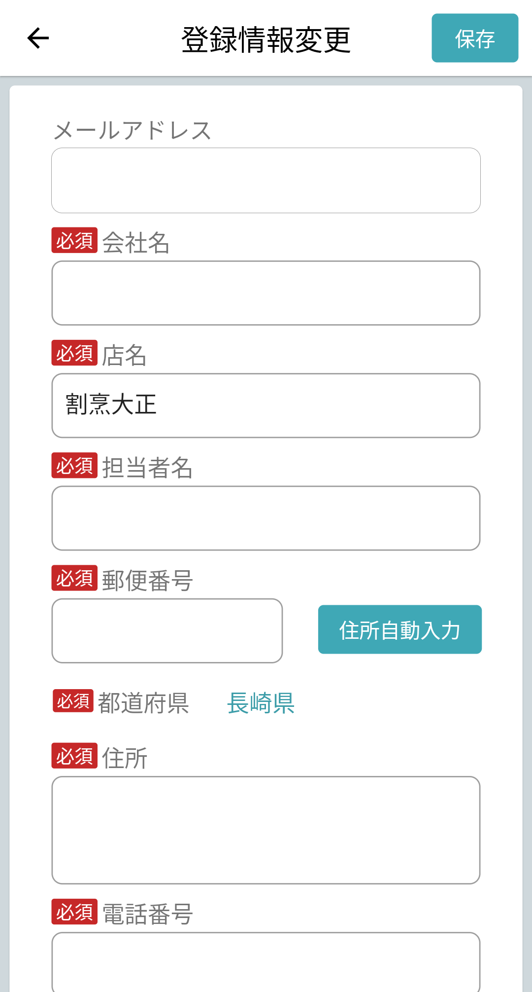 2.会社名、店名、担当者名、郵便番号、都道府県、住所、電話番号を入力し、右上保存ボタンを押すと、ユーザ情報を更新し保存できる。