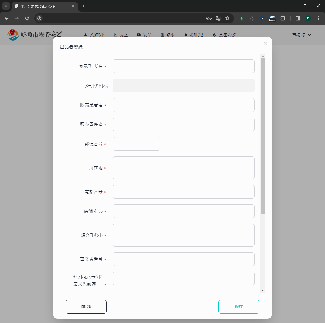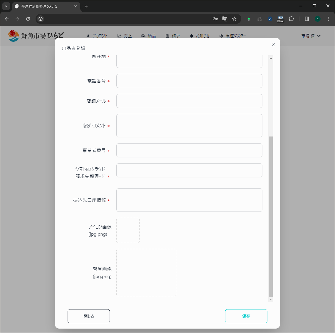 3.表示ユーザ名、販売業者名、販売責任者、郵便番号、住所、電話番号、店舗メール、紹介コメント、事業者番号、ヤマトB2クラウド請求先顧客コード、振込先口座番号、アイコン画像、背景画像を入力し、右下保存ボタンを押すと、ユーザ情報を更新し保存できる。